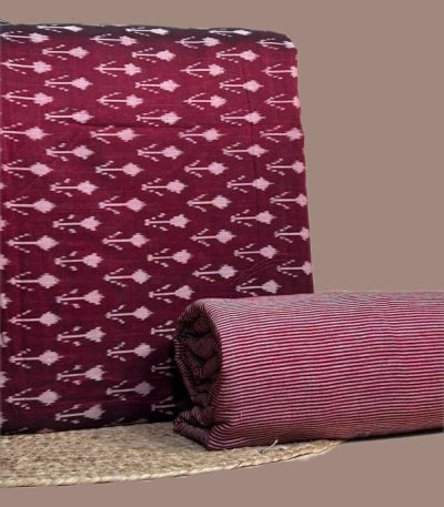Maroon – 2pc HandCrafted Ikkat Top and Handloom Stripes Soft Cotton Bottom Fabric Set
