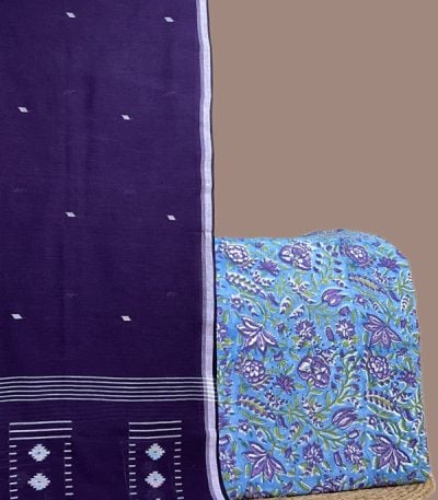 Blue – 2pc Handloom Cotton Dupatta and Blockprinted Soft Cotton Top Set
