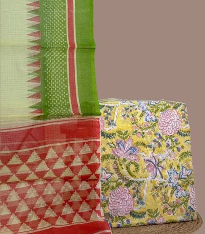 2.50mtr Each– Kota Doria Dupatta with HandBlock Printed Pure Soft Cotton Top Fabric Set
