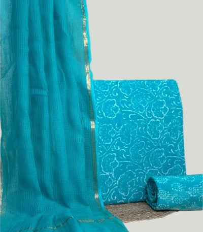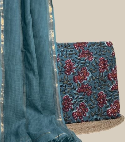 Blue – 3pc Kota Doria Dupatta with Bagru Blockprint Cotton Top & Bottom Set