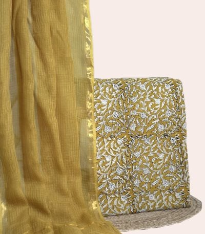 Yellow – 2pc Kota Doria Dupatta and Pure Soft Cotton Blockprint Top Fabric Set