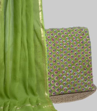 Green – 2pc Kota Doria Dupatta and Pure Soft Cotton Blockprint Top Fabric Set