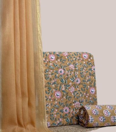Yellow – 3pc Kota Doria Dupatta with Blockprint Soft Cotton Top & Bottom Set