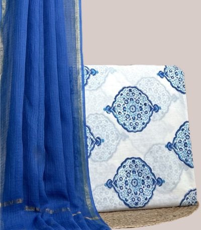 White – 2pc Kota Doria Dupatta and Pure Soft Cotton Blockprint Top Fabric Set