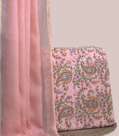 Pink – 2pc Kota Doria Dupatta and Pure Soft Cotton Blockprint Top Fabric Set