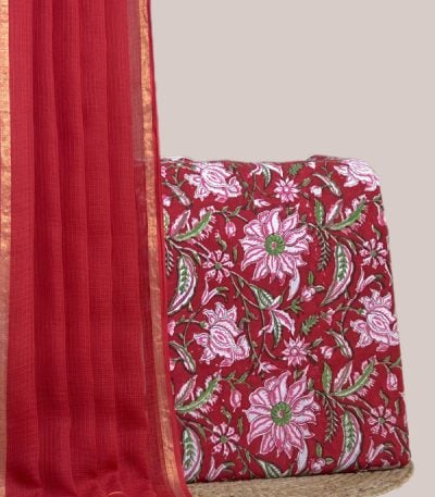 Red – 2pc Kota Doria Dupatta and Pure Soft Cotton Blockprint Top Fabric Set