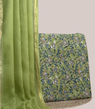 Green – 2pc Kota Doria Dupatta and Pure Soft Cotton Blockprint Top Fabric Set