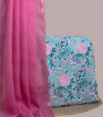 Pink – 2pc Kota Doria Dupatta and Pure Soft Cotton Blockprint Top Fabric Set