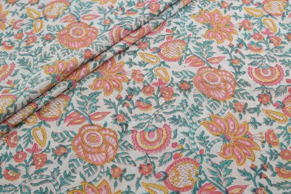 Pre-Cut 2.20m White Floral Handblock Printed 100% Pure Soft Cotton Fabric