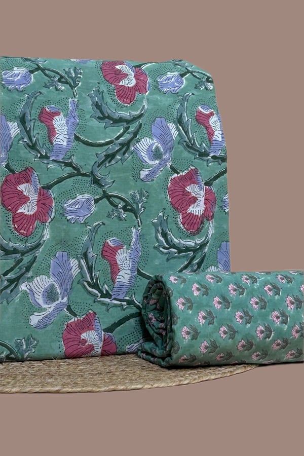 Green - 2pc Pure Soft Cotton Blockprinted Top and Bottom Fabric Set