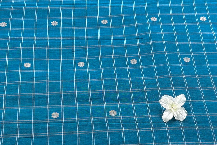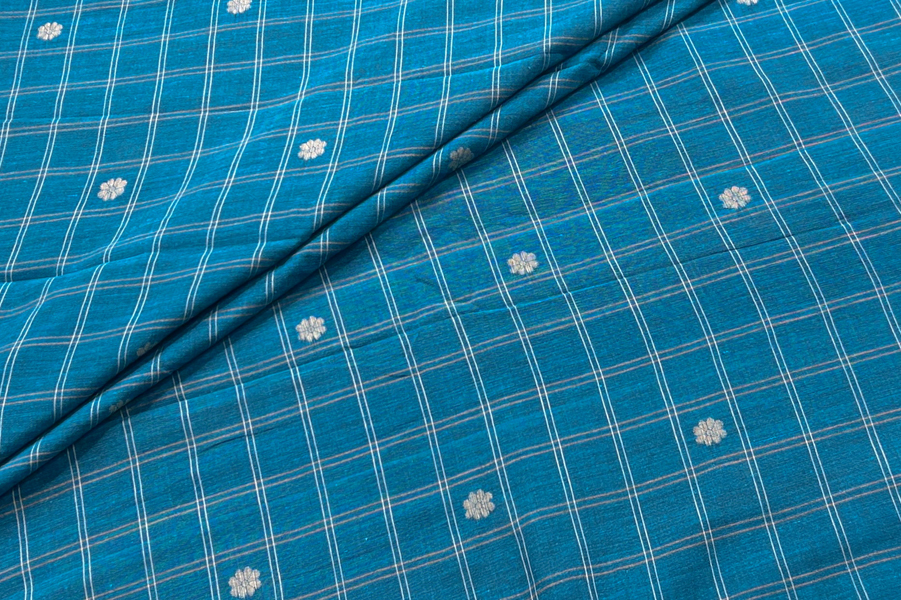 Sea Blue Checkered Woven Design Flowy HandLoom Pure Soft Cotton Fabric