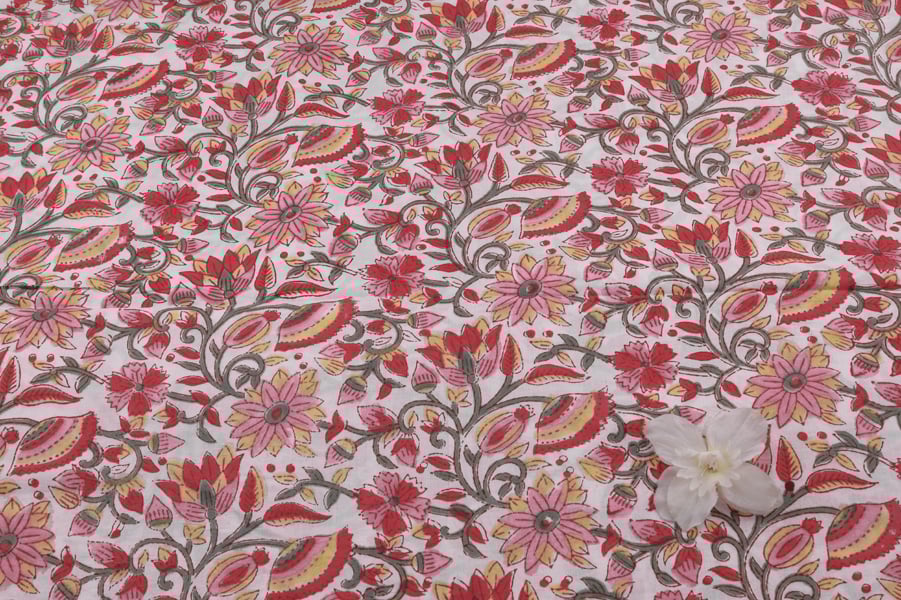 White Floral Handblock Printed 100% Pure Soft Cotton Fabric