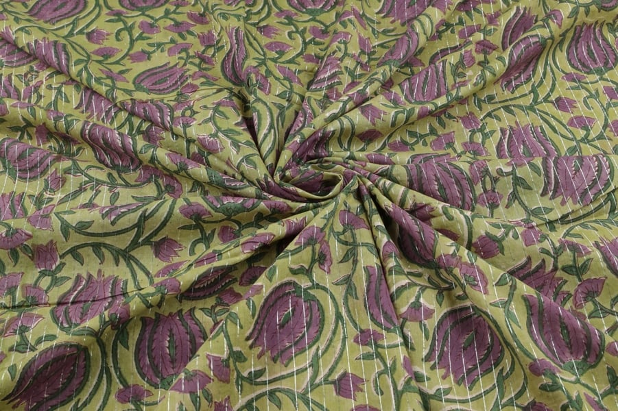 Avocado Green Self-Zari Stripes Floral Handblock Printed 100% Pure Soft Cotton Fabric