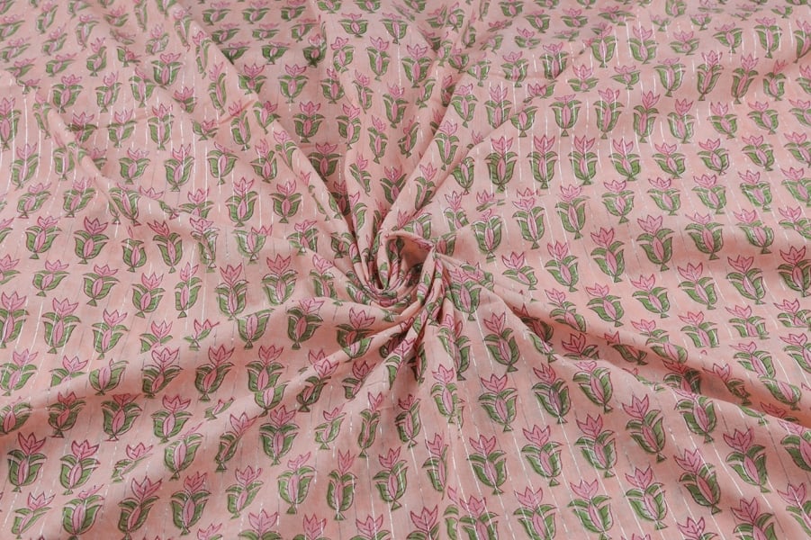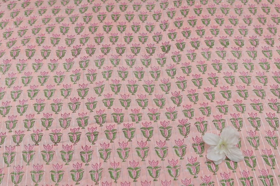 Baby Pink Self-Zari Stripes Floral Handblock Printed 100% Pure Soft Cotton Fabric