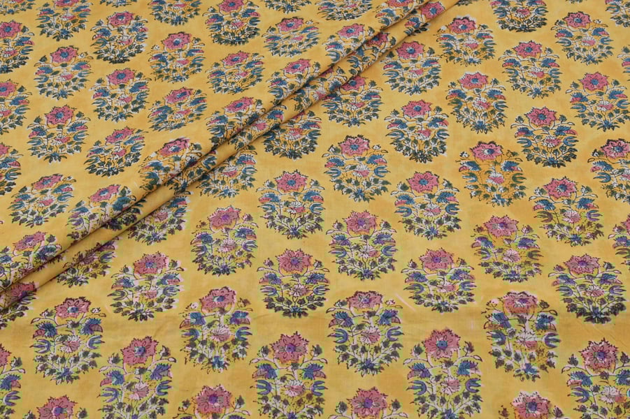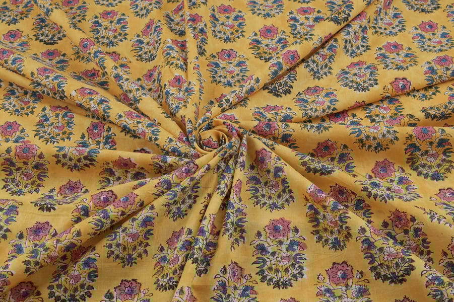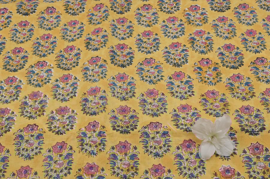 Bright Yellow Floral Handblock Printed 100% Pure Soft Cotton Fabric