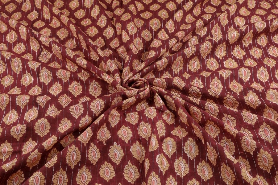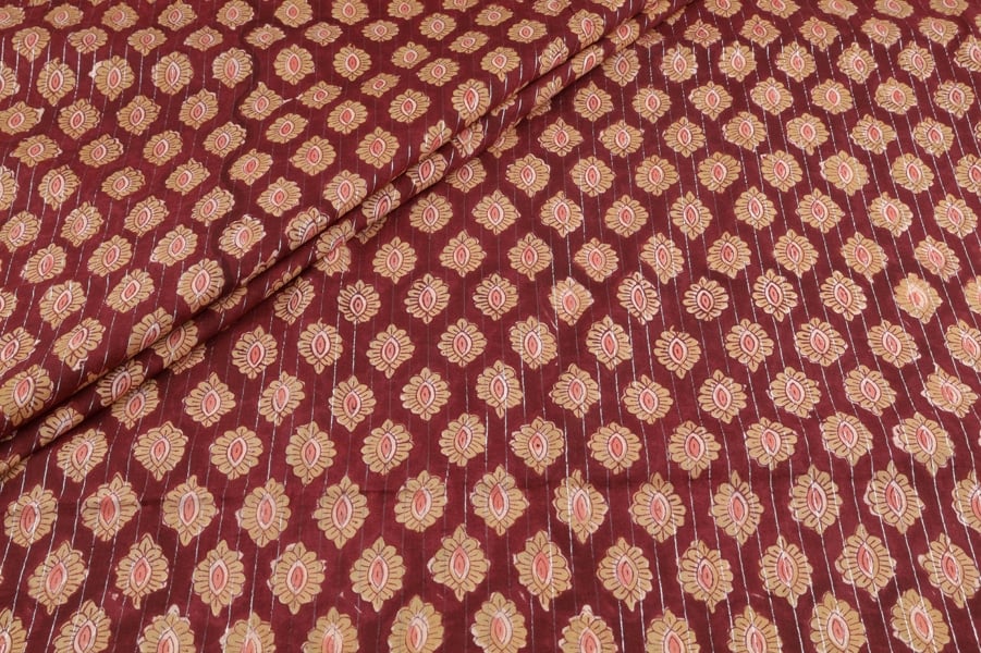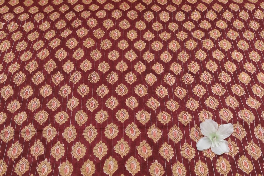 Brownish Red Self-Zari Stripes Floral Handblock Printed 100% Pure Soft Cotton Fabric