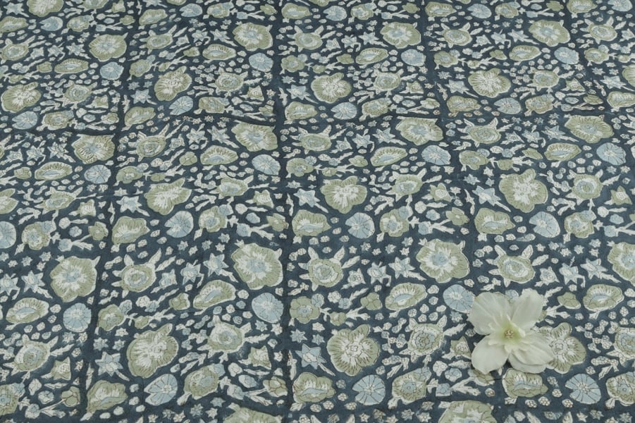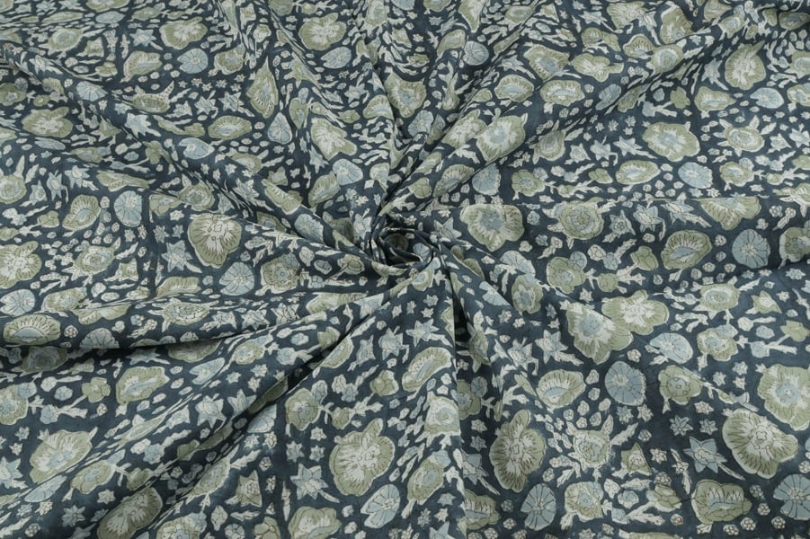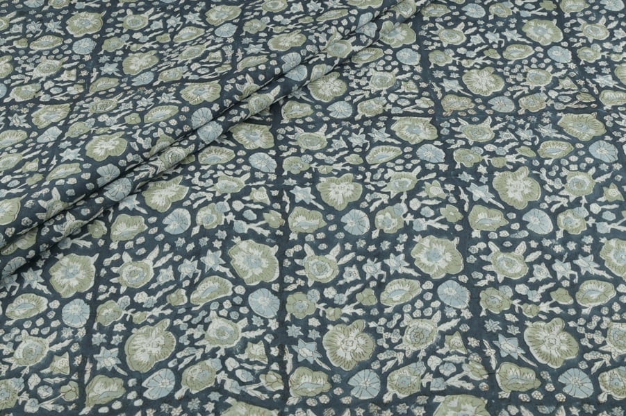 Charcoal Blue Floral Handblock Printed 100% Pure Soft Cotton Fabric