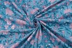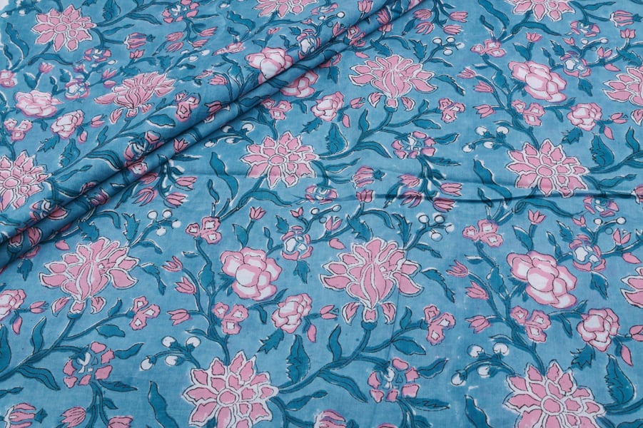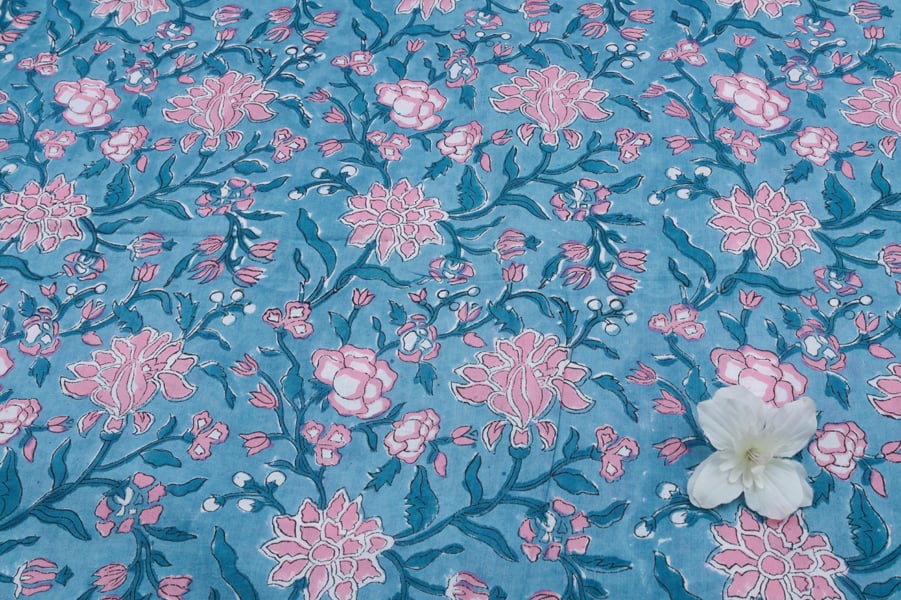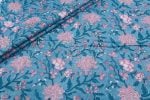 Cool Sky Blue Floral Handblock Printed 100% Pure Soft Cotton Fabric