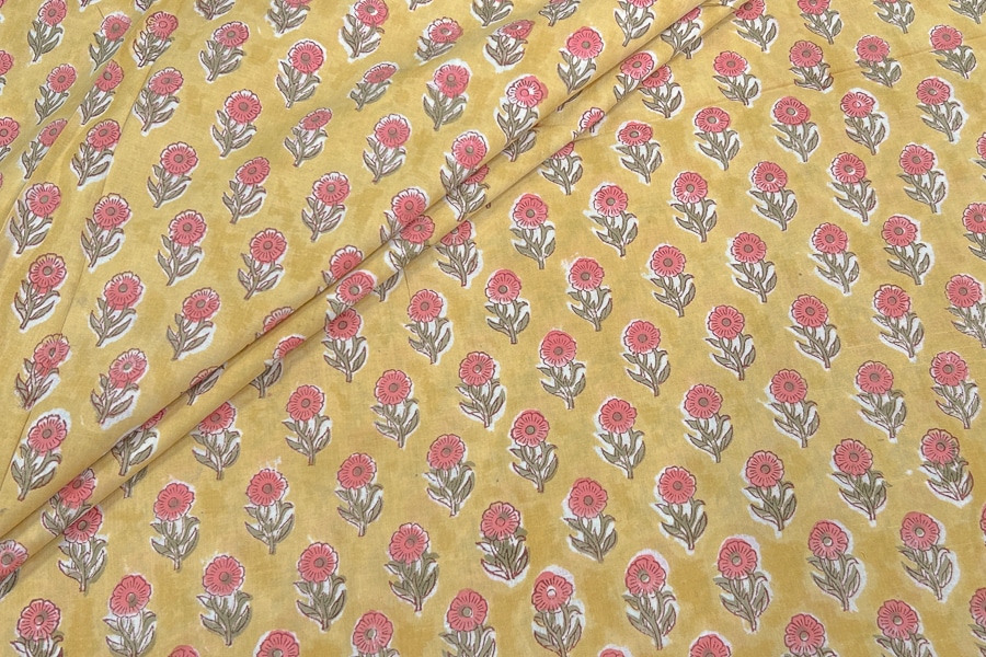 Daisy Yellow Floral Handblock Printed 100% Pure Soft Cotton Fabric