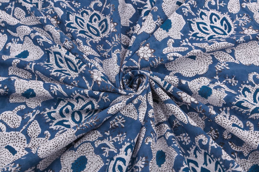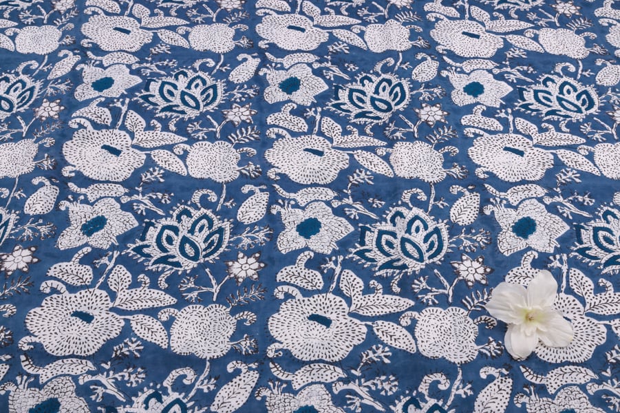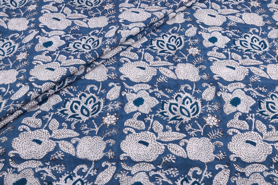 Sky Blue Floral Handblock Printed 100% Pure Soft Cotton Fabric
