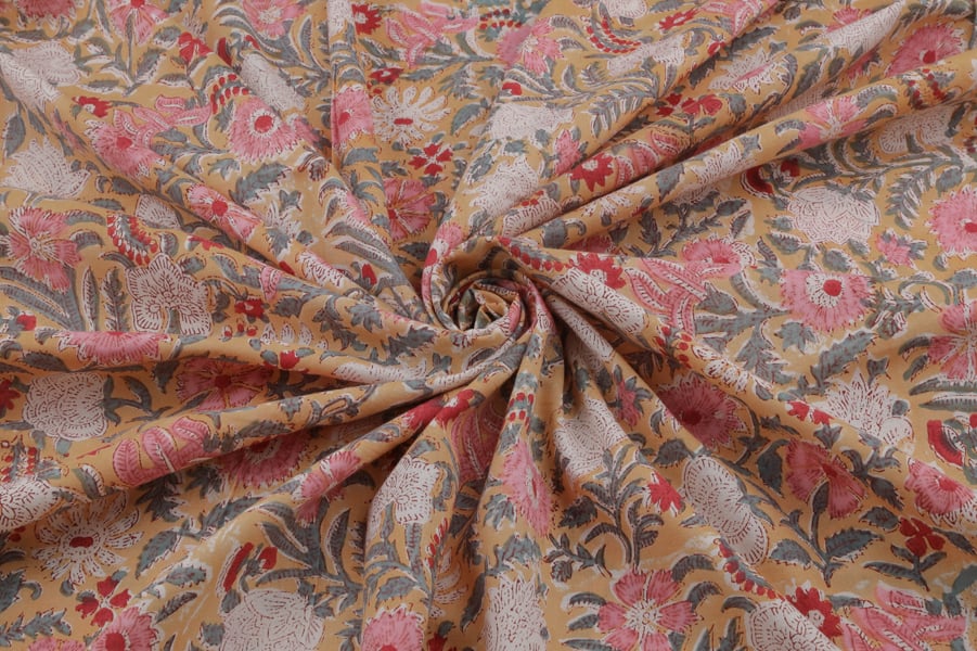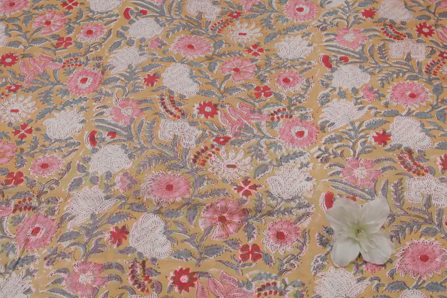 Flax Yellow Floral Handblock Printed 100% Pure Soft Cotton Fabric