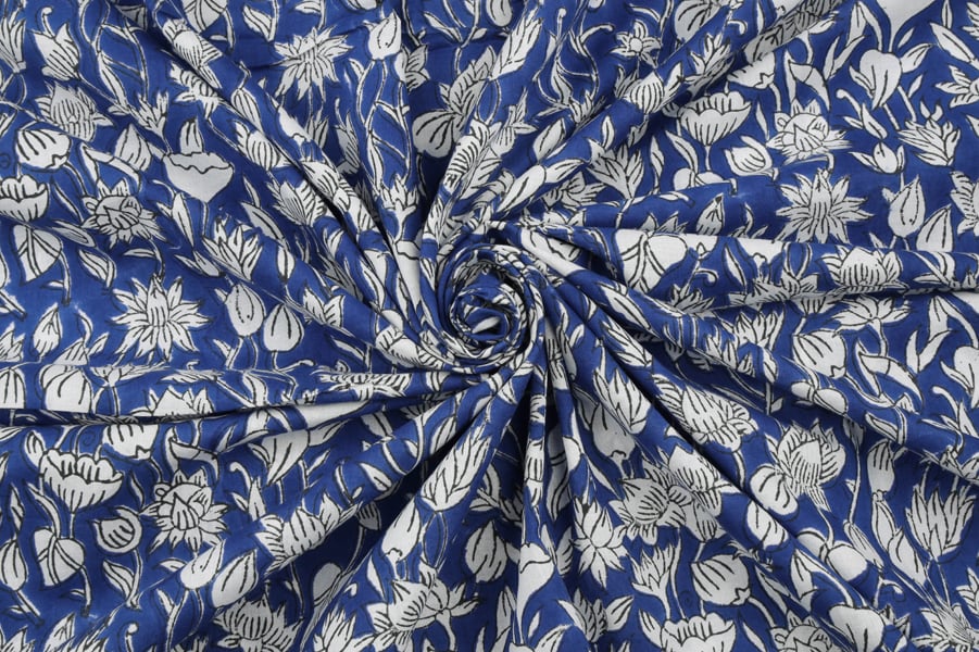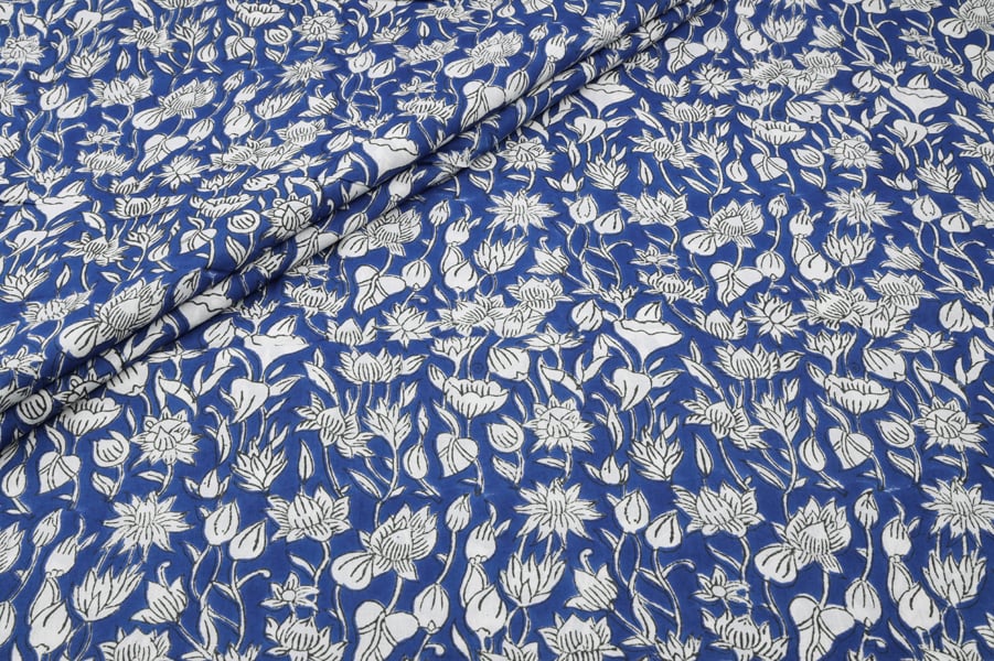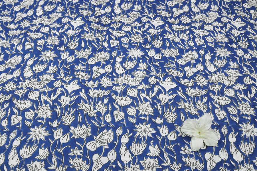 French Blue Floral Handblock Printed 100% Pure Soft Cotton Fabric