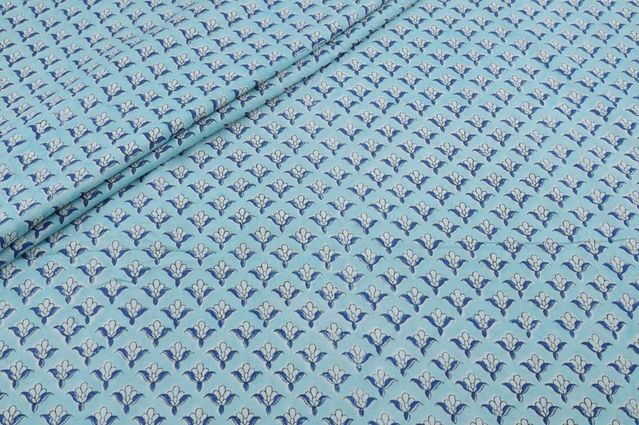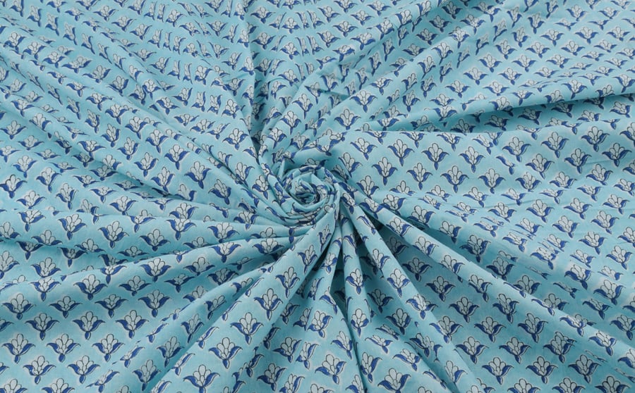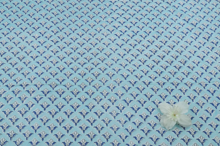 Icy Blue Floral Handblock Printed 100% Pure Soft Cotton Fabric