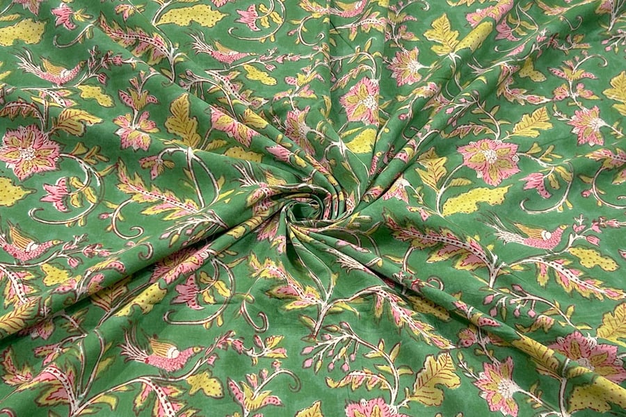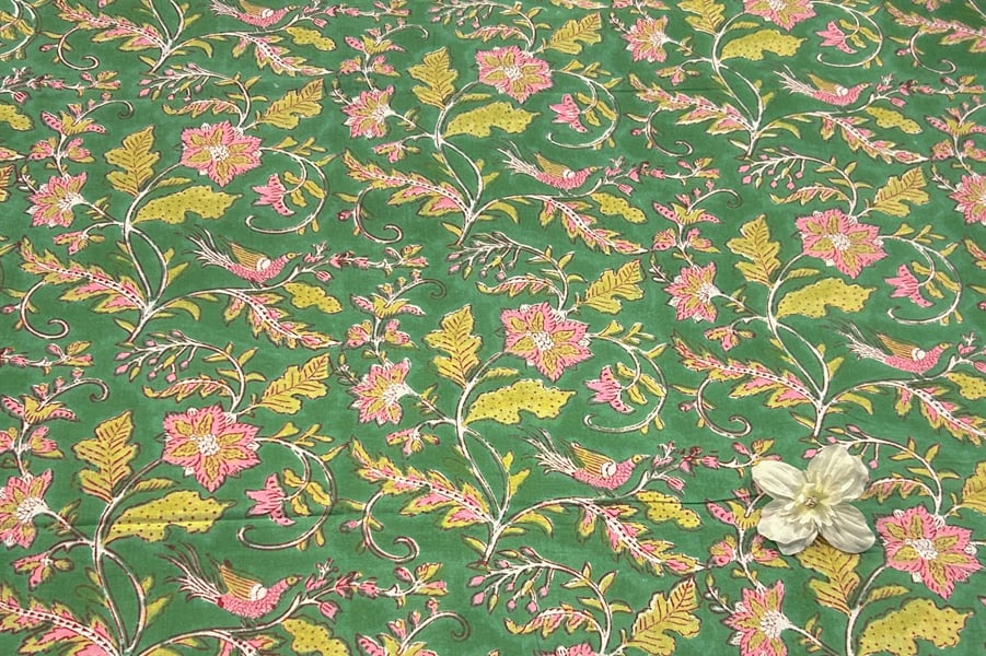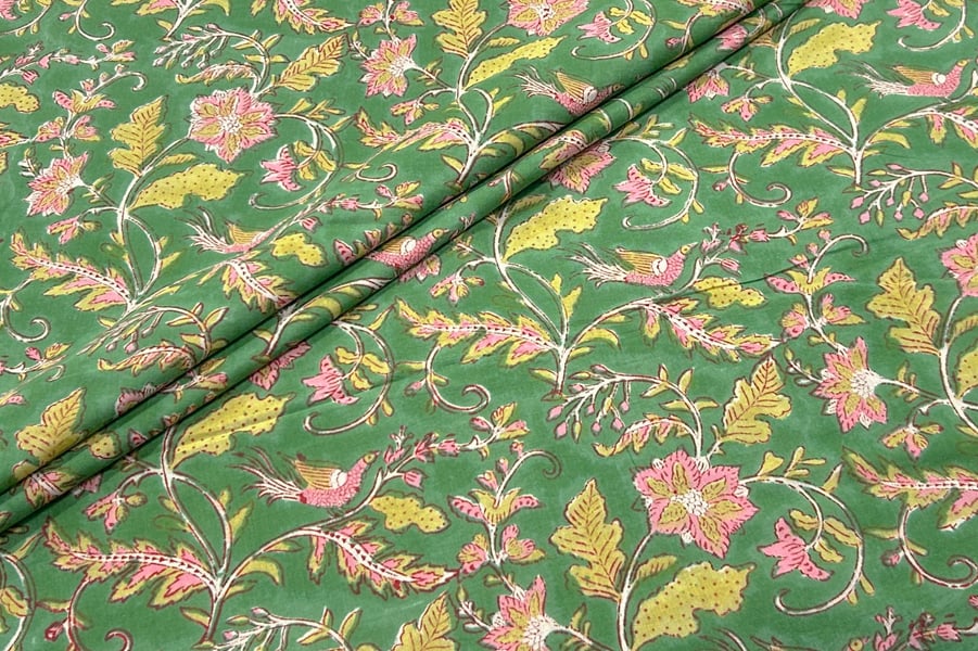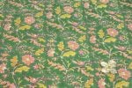 Jade Green Floral Handblock Printed 100% Pure Soft Cotton Fabric