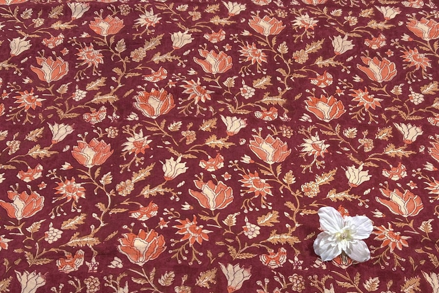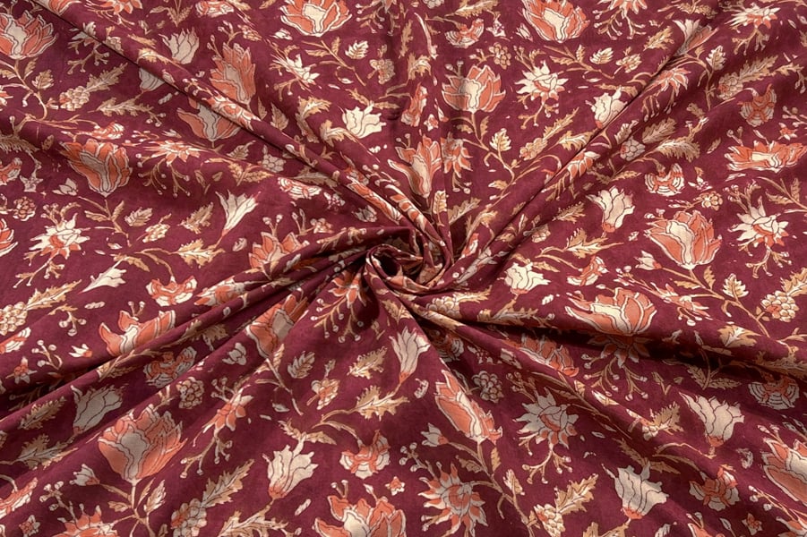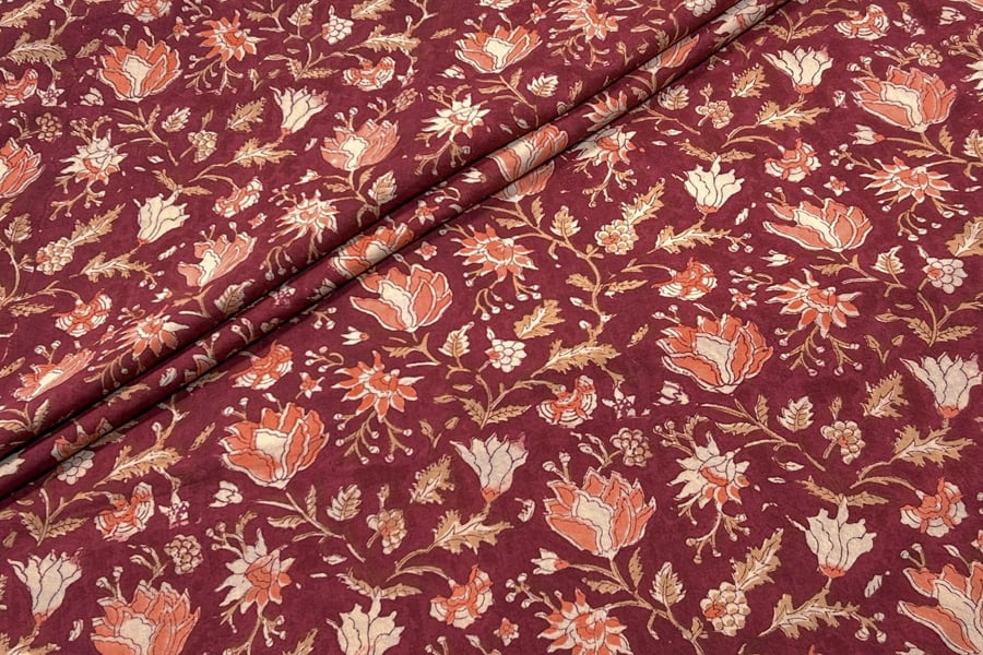 Maroon Red – Floral Handblock Printed 100% Pure Cotton Fabric