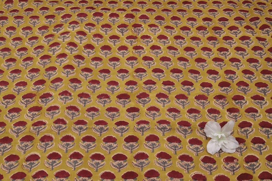 Metallic Gold Yellow Floral Handblock Printed 100% Pure Soft Cotton Fabric