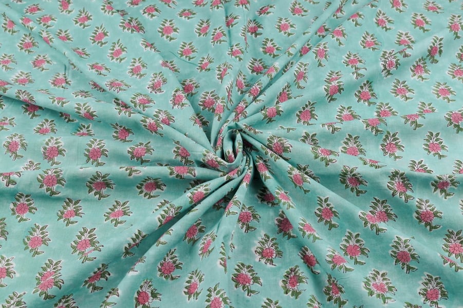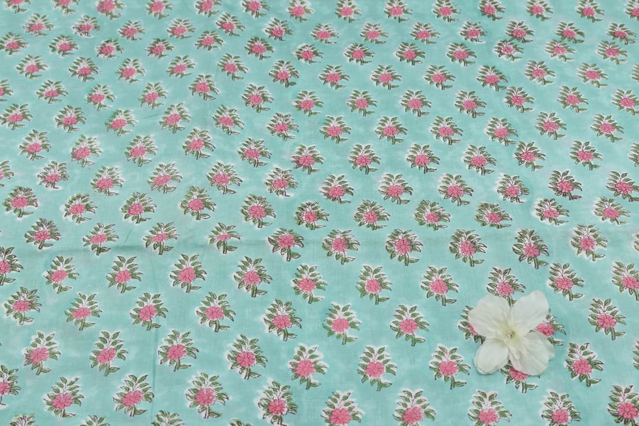 Pastel Blue Floral Handblock Printed 100% Pure Soft Cotton Fabric