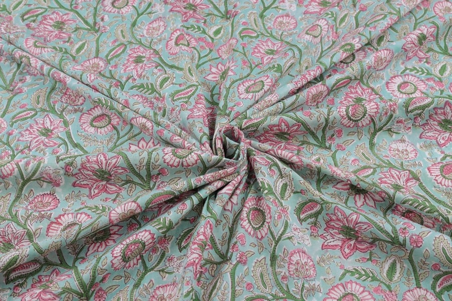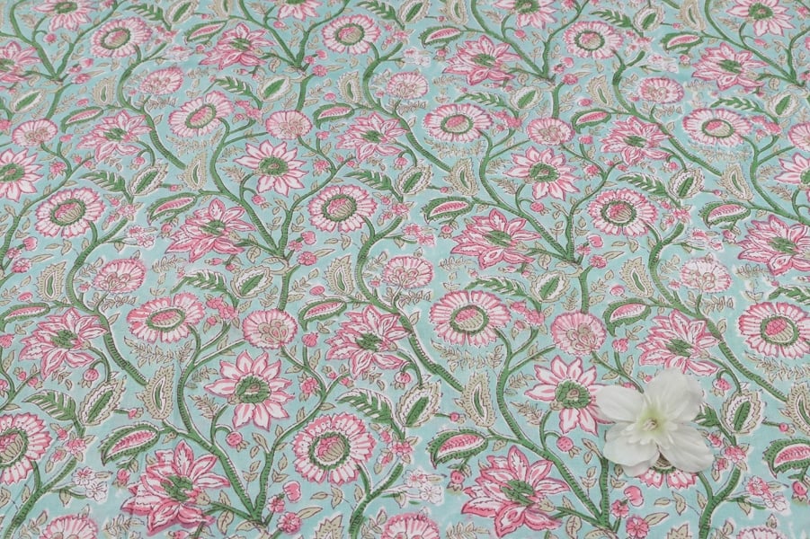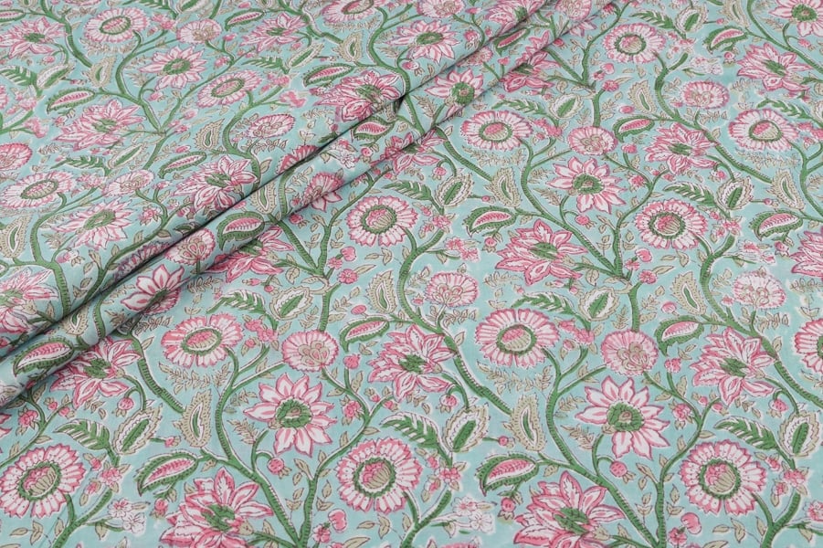 Pastel Blue Floral Handblock Printed 100% Pure Soft Cotton Fabric