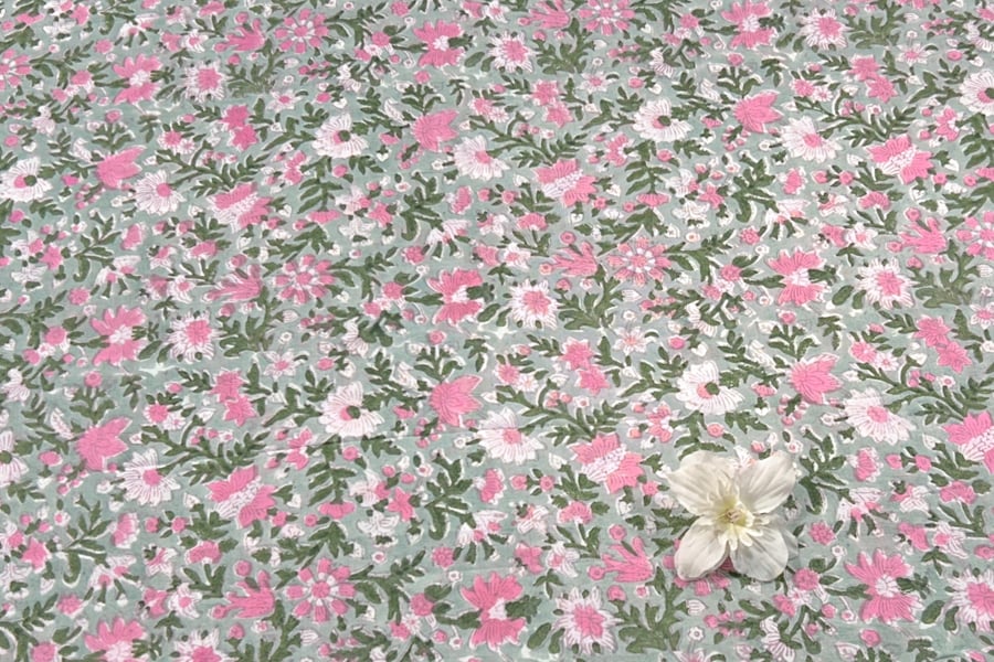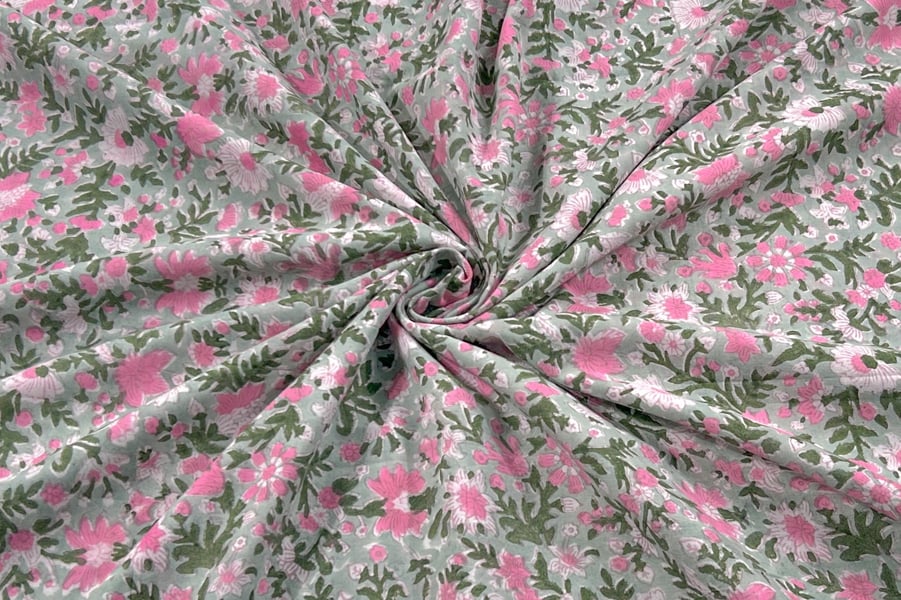 Pastel Mint Green – Floral Handblock Printed 100% Pure Cotton Fabric