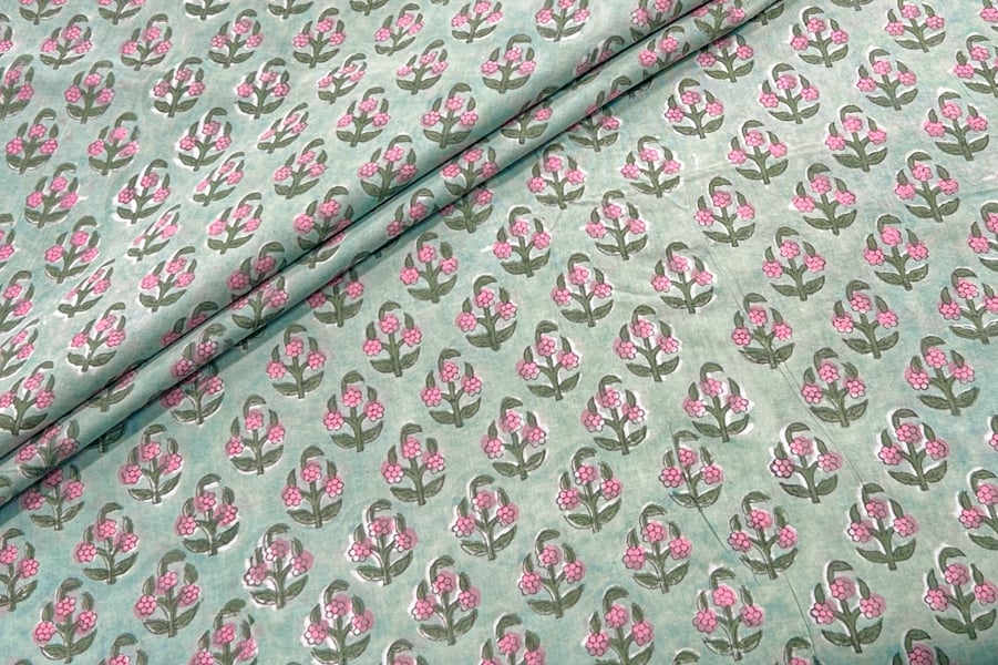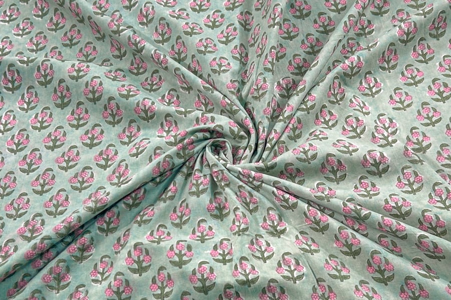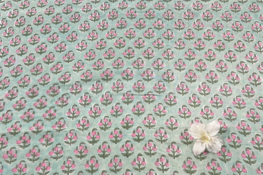 Pastel Mint Green – Floral Handblock Printed 100% Pure Cotton Fabric