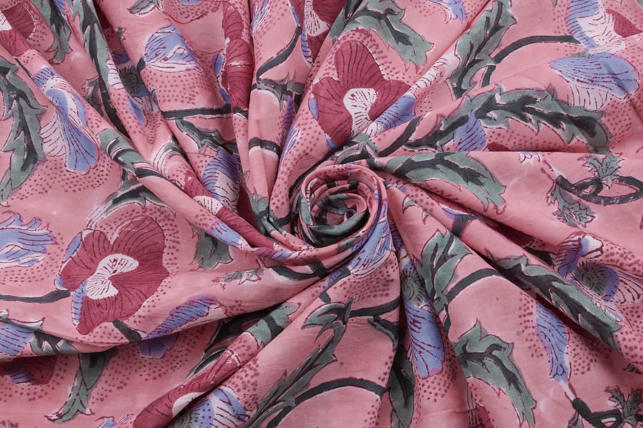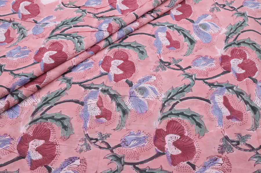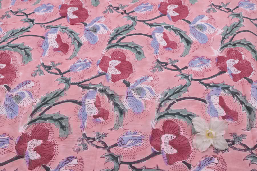 Pink Floral Handblock Printed 100% Pure Soft Cotton Fabric