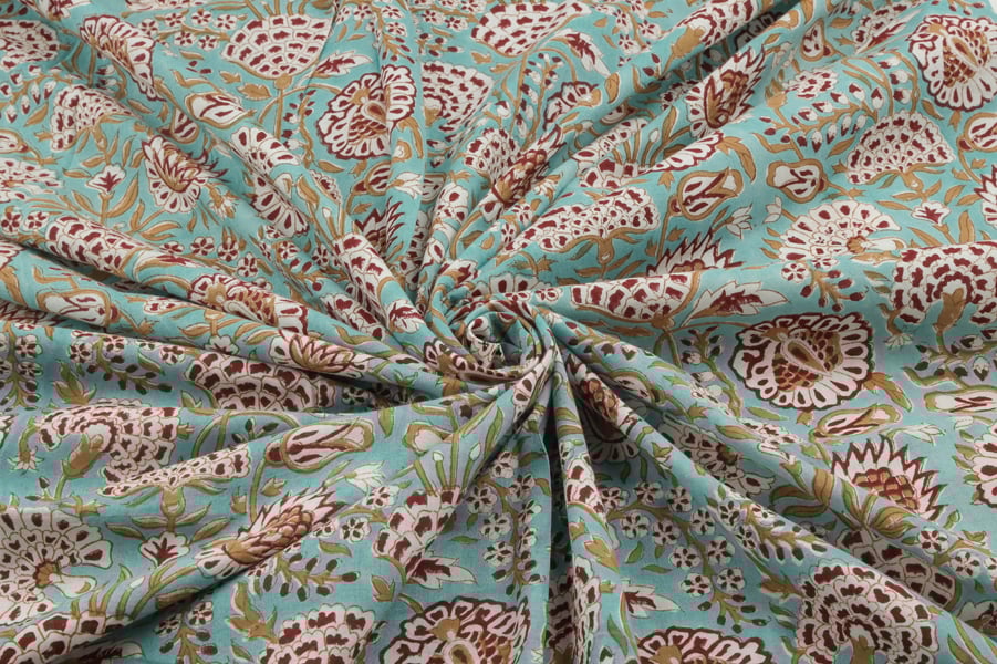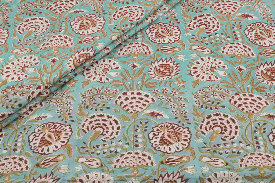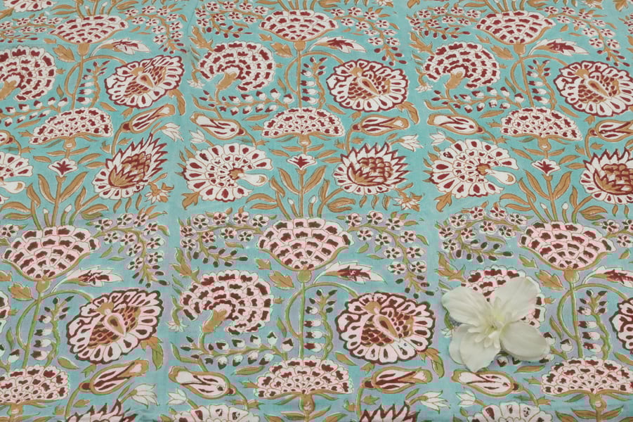 Powder Blue Floral Handblock Printed 100% Pure Soft Cotton Fabric