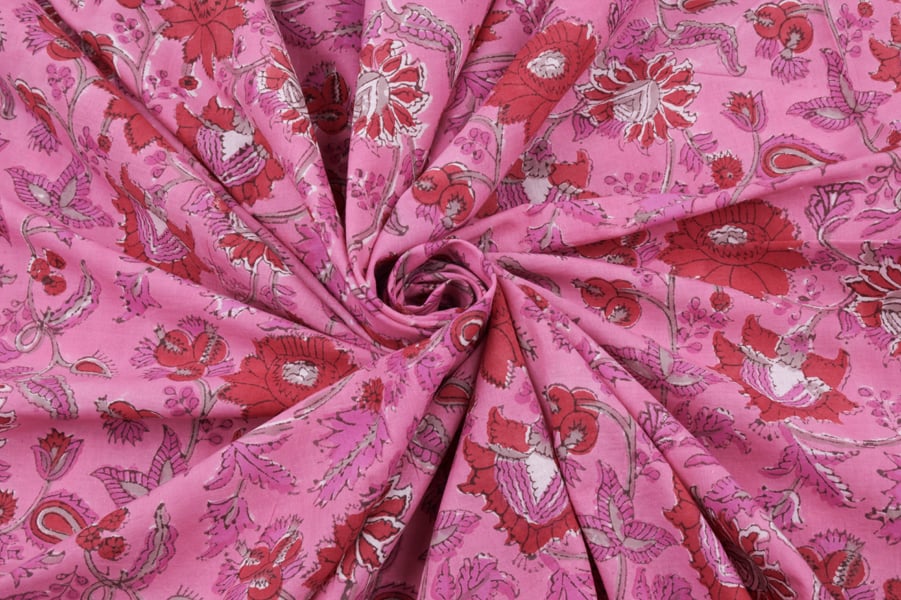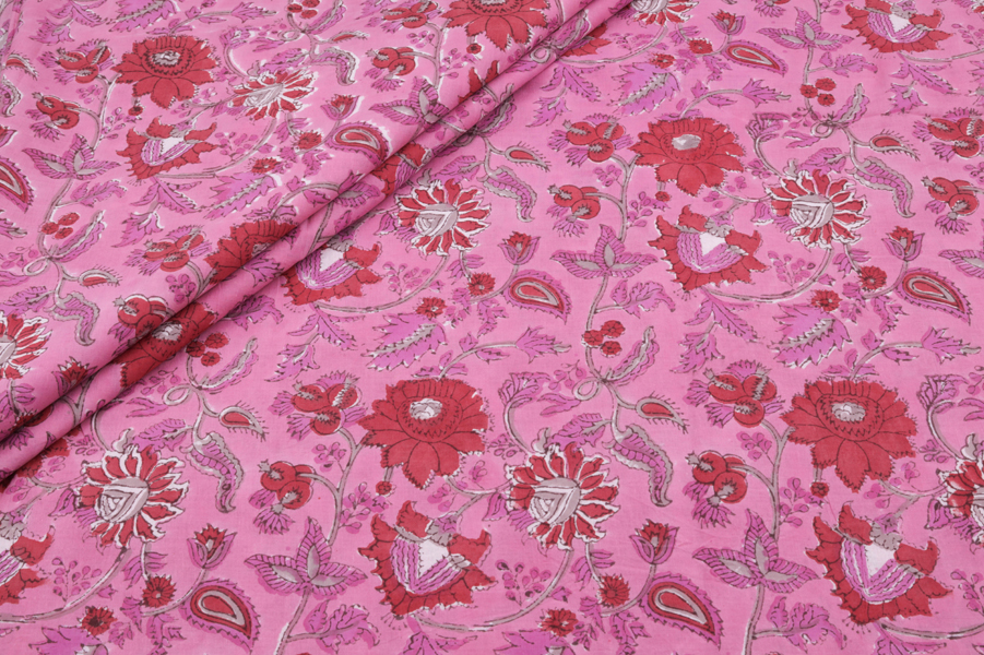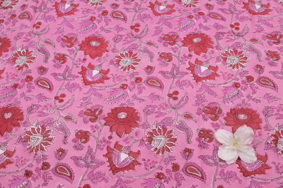 Fuchsia Pink Floral Handblock Printed 100% Pure Soft Cotton Fabric