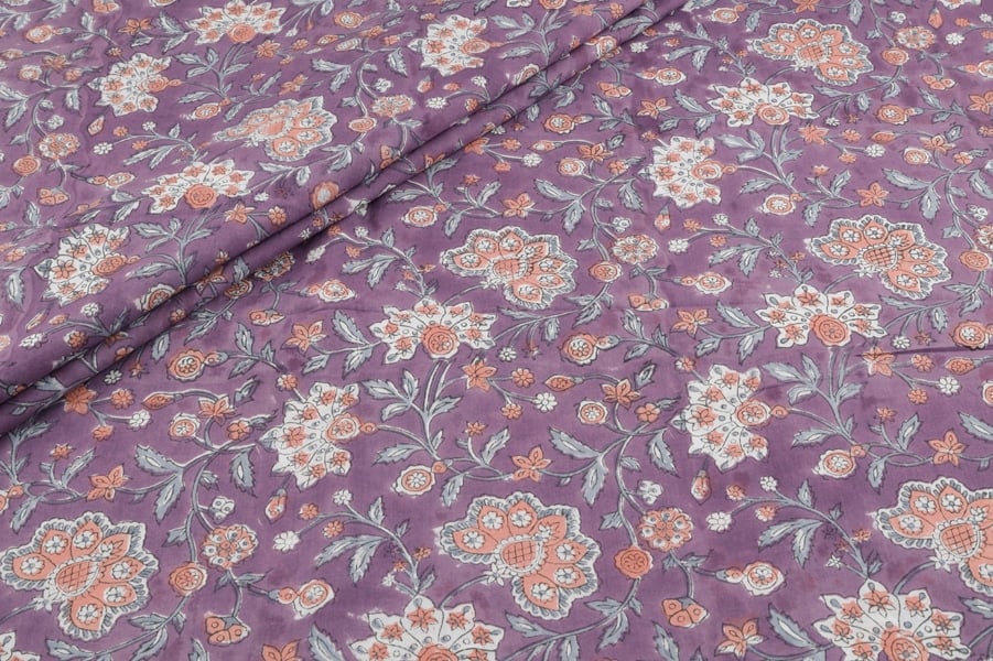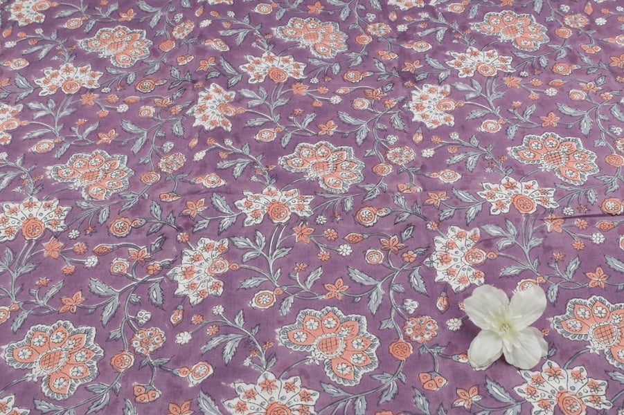 Purple Floral Handblock Printed 100% Pure Soft Cotton Fabric