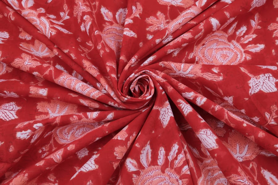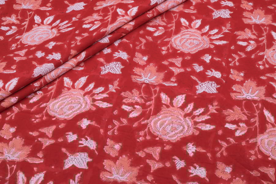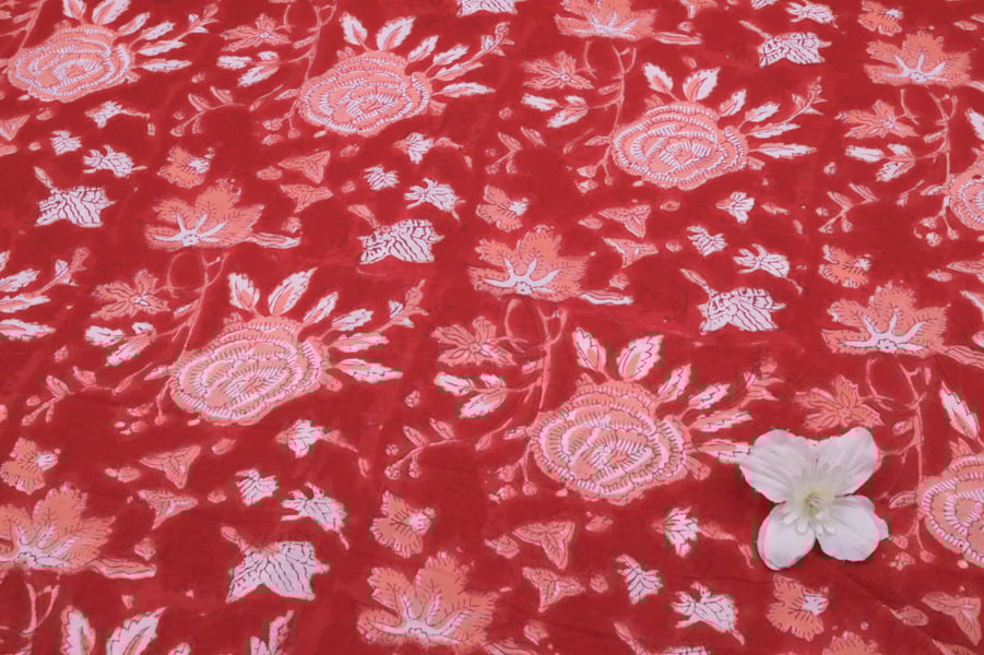 Scarlet Red Floral Handblock Printed 100% Pure Soft Cotton Fabric