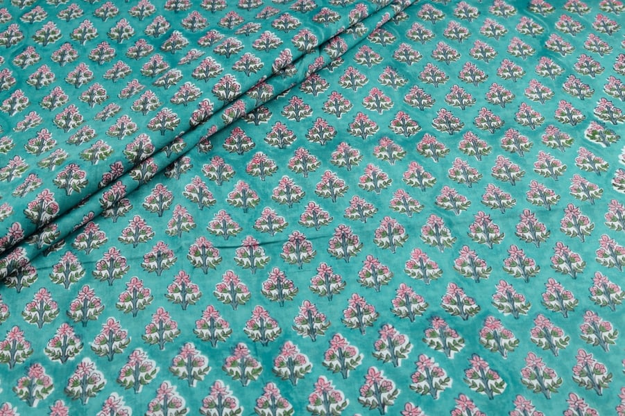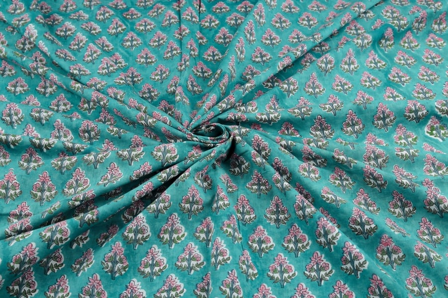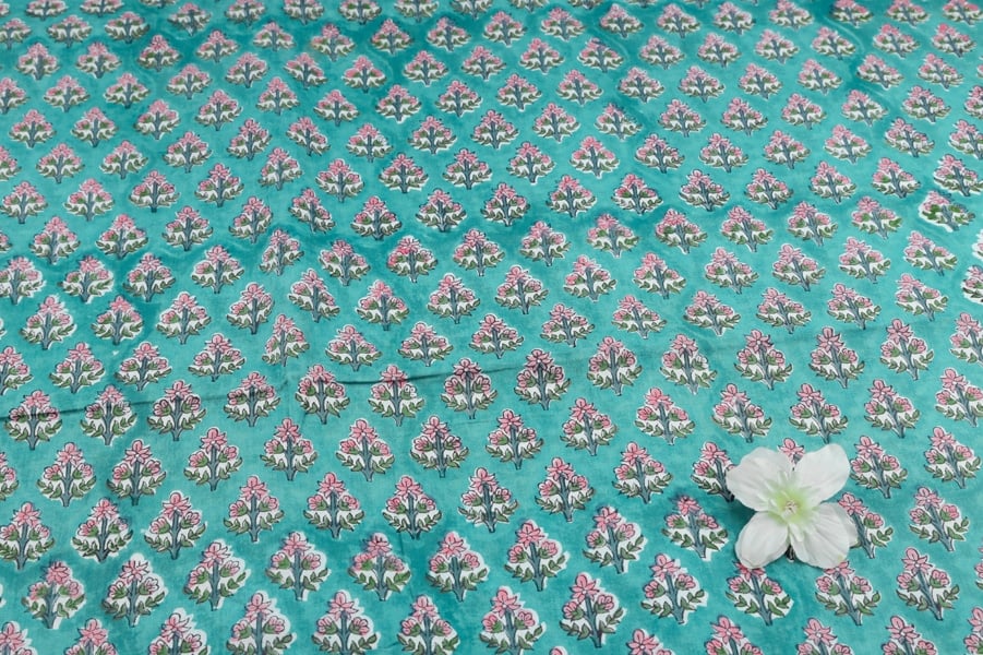 Tiffany Blue Floral Handblock Printed 100% Pure Soft Cotton Fabric