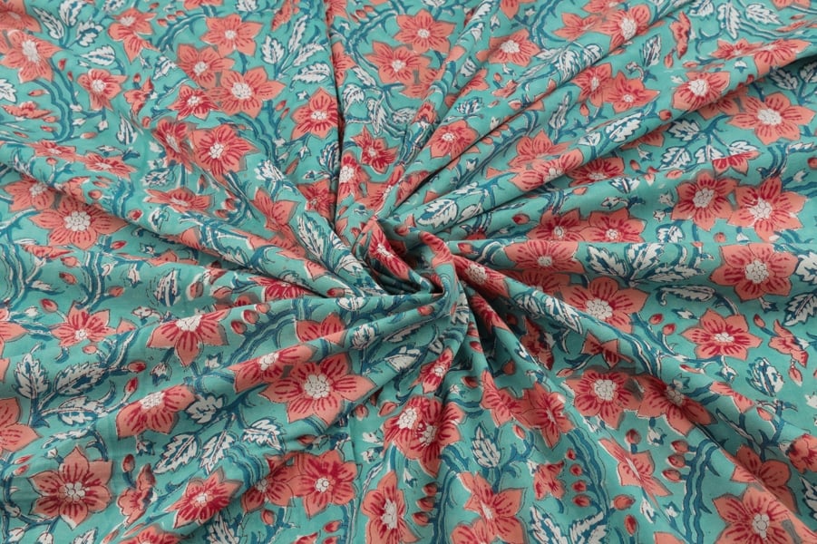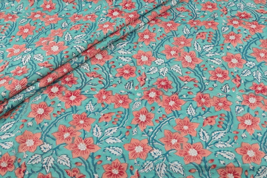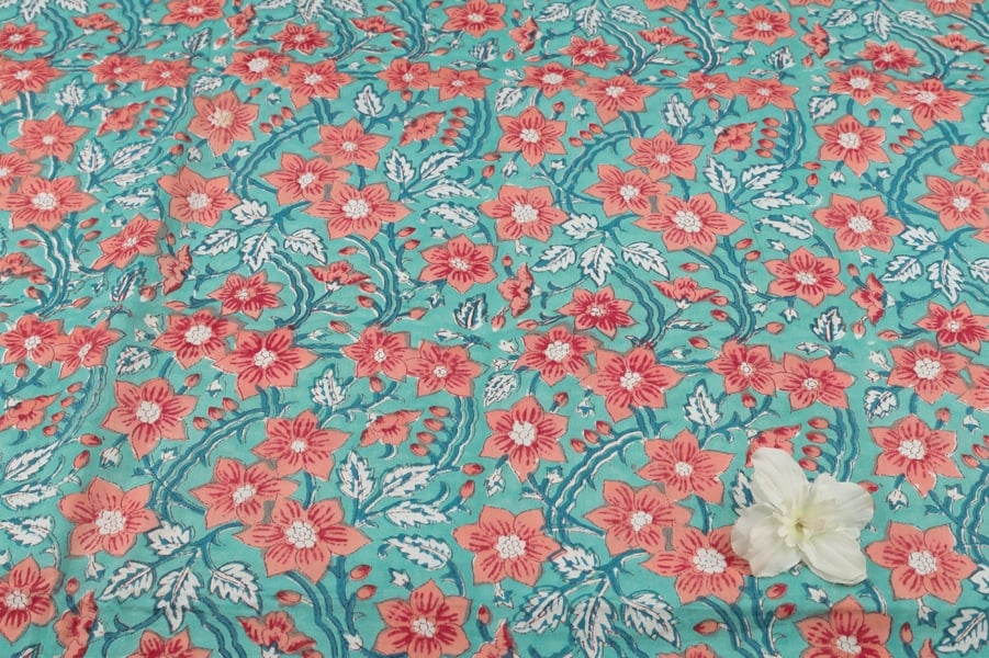 Turquoise Blue Floral Handblock Printed 100% Pure Soft Cotton Fabric