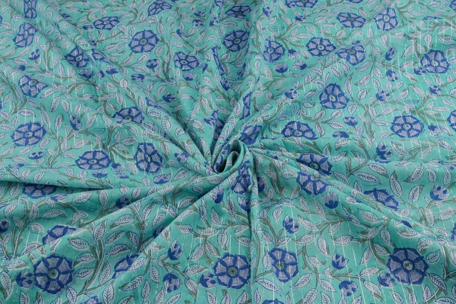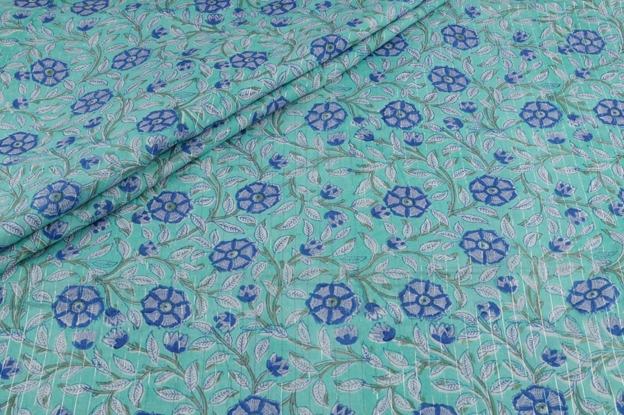 Turquoise Self-Zari Stripes Floral Handblock Printed 100% Pure Soft Cotton Fabric