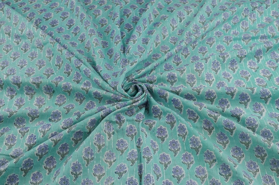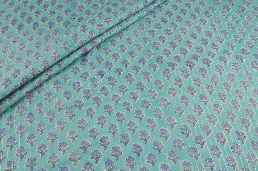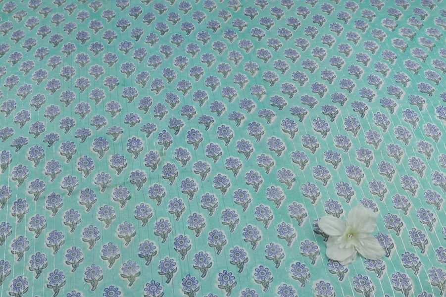 Turquoise Self-Zari Stripes Floral Handblock Printed 100% Pure Soft Cotton Fabric