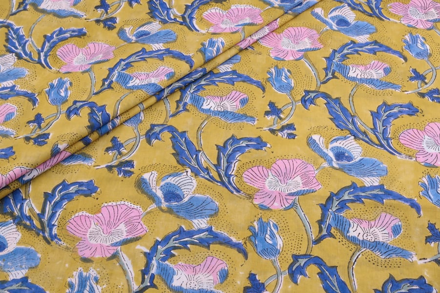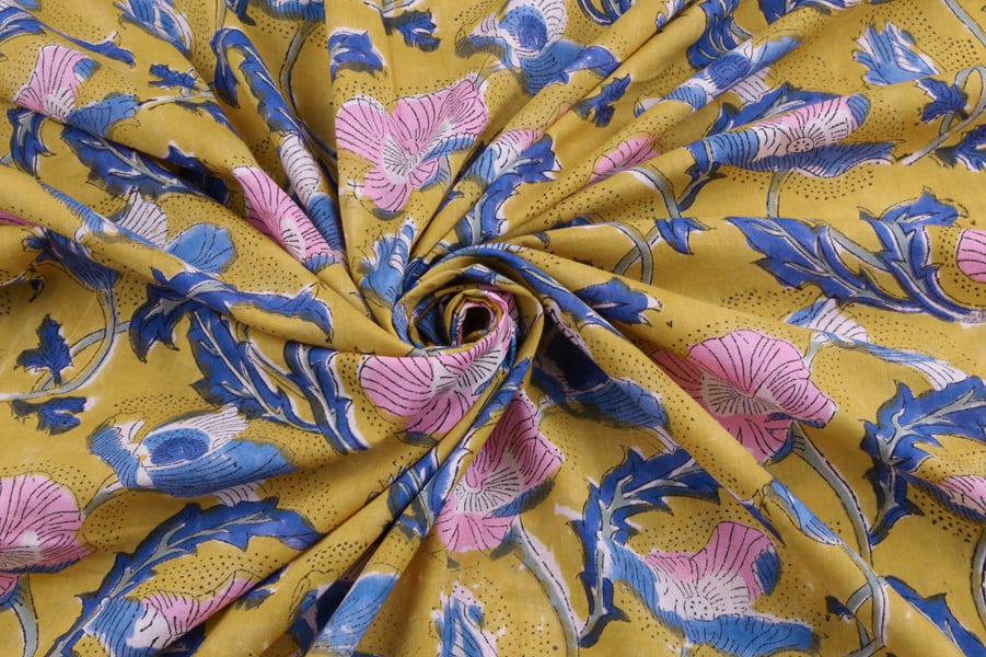 Tuscan Sun Yellow Floral Handblock Printed 100% Pure Soft Cotton Fabric