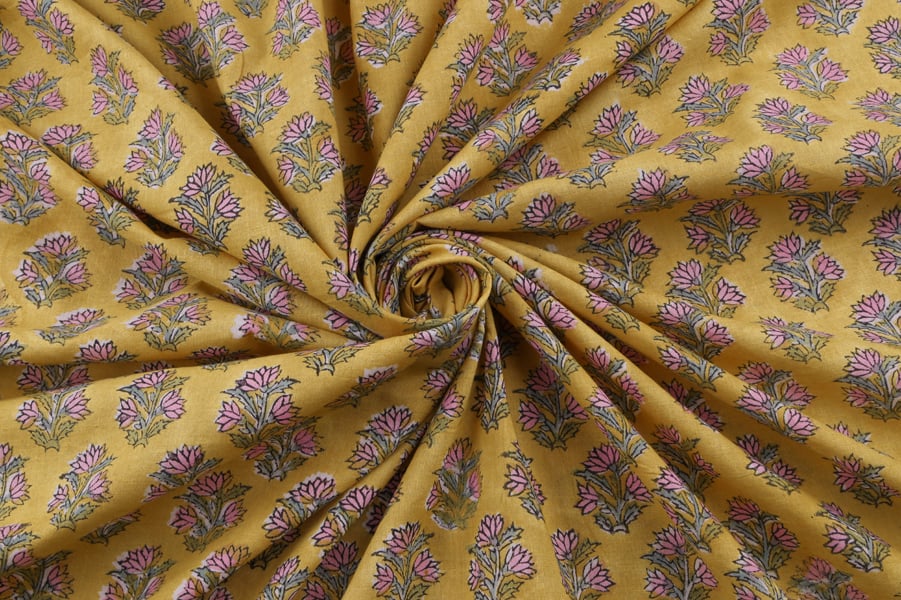 Warm Sand Yellow Floral Handblock Printed 100% Pure Soft Cotton Fabric