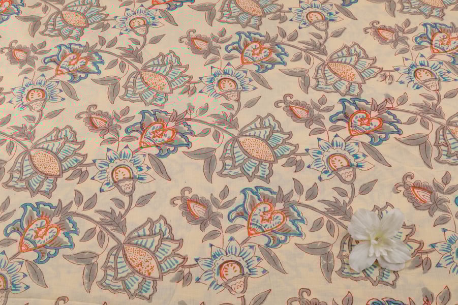 White Floral Handblock Printed 100% Pure Soft Cotton Fabric