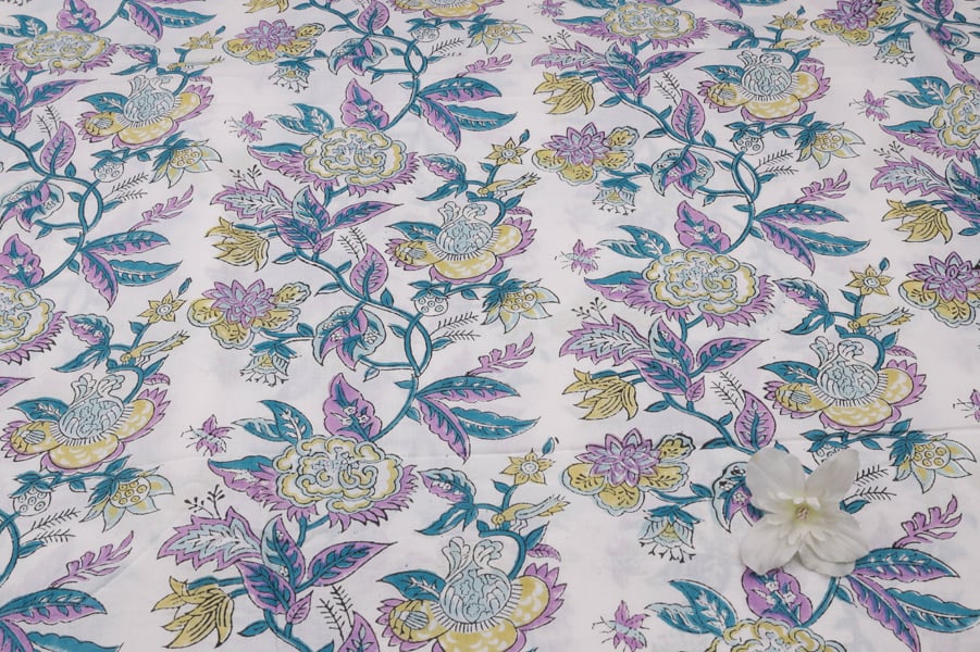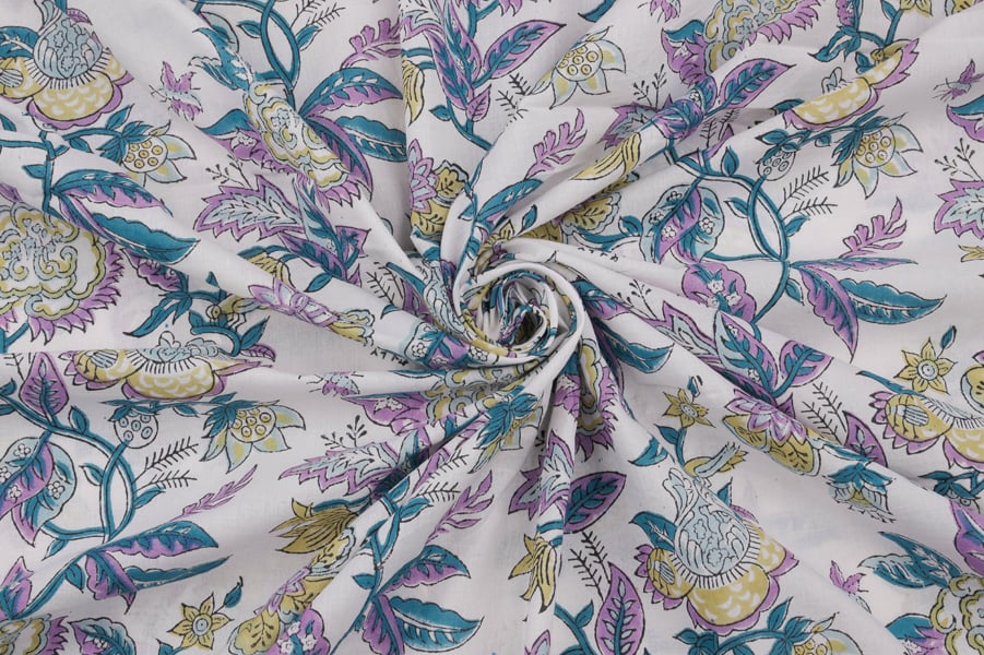 White Floral Handblock Printed 100% Pure Soft Cotton Fabric