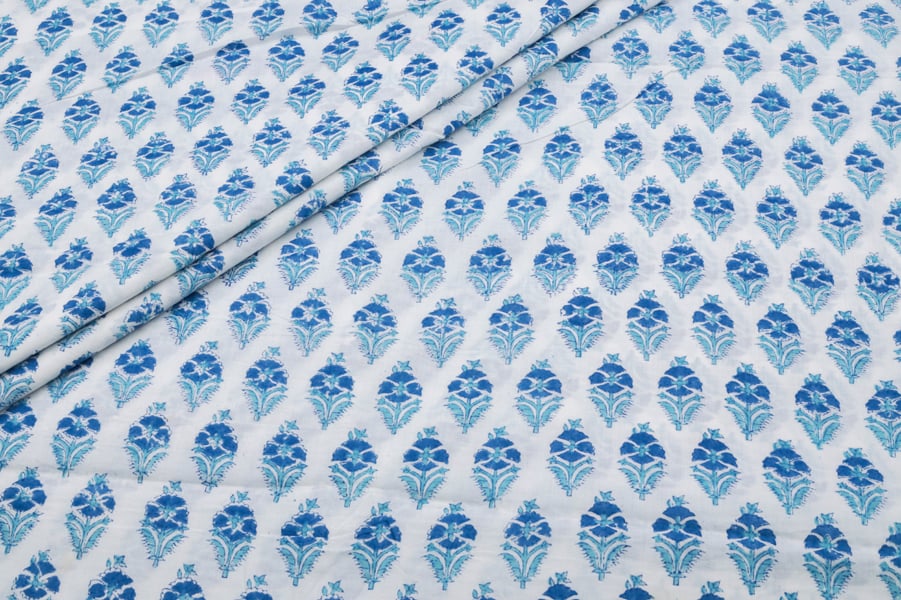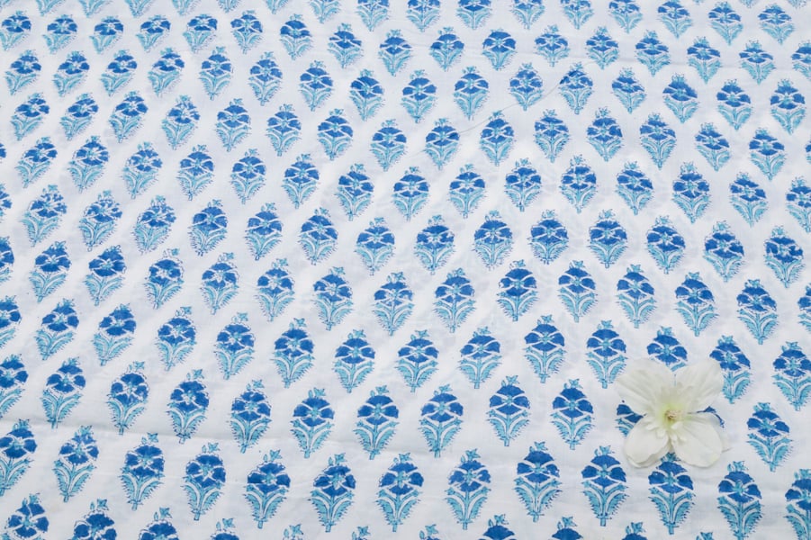 White Floral Handblock Printed 100% Pure Soft Cotton Fabric