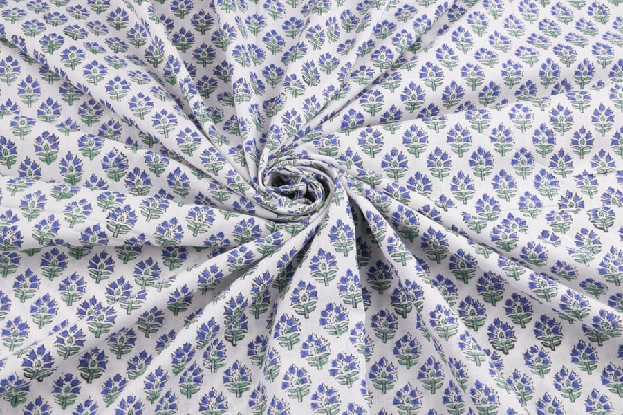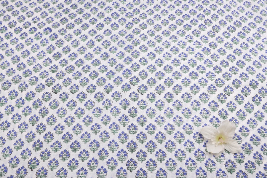 Sky Blue Floral Handblock Printed 100% Pure Soft Cotton Fabric