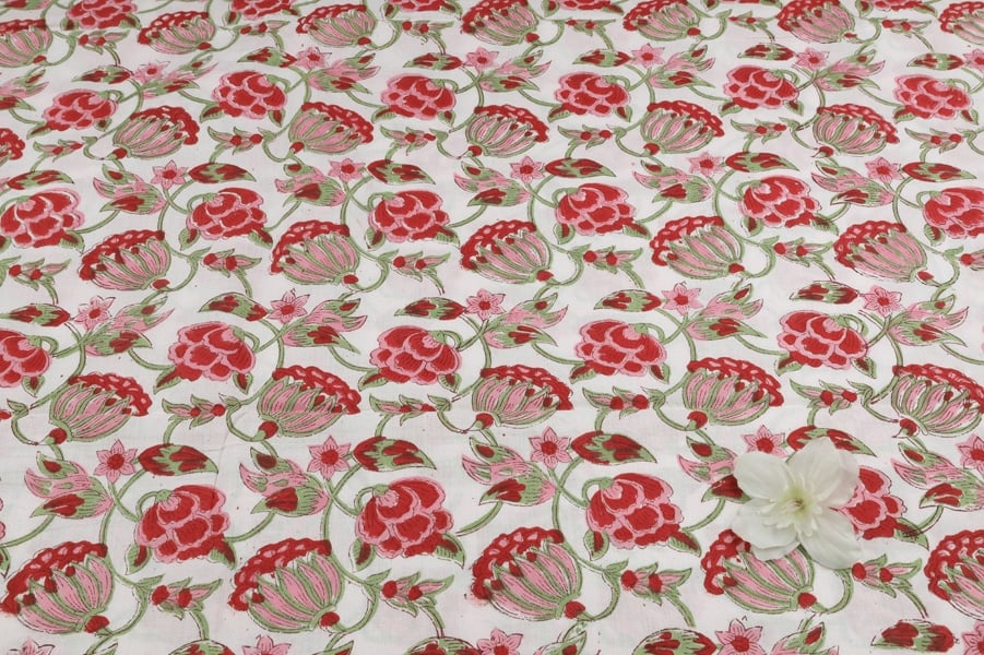 White Floral Handblock Printed 100% Pure Soft Cotton Fabric